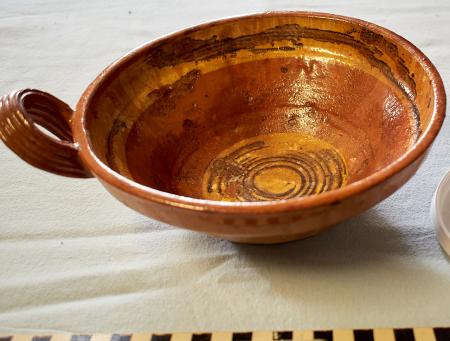 Keramikkärlet tillverkades av Granfors bruk i Övermark (18 / 1900-tal?) och donerades av Adele Englund 1961 till Pörtom hembygdsförenings samlingar. Keramikkärlet är gjord av rödaktig lera och har glaserats på både in- och utsidan av kärlet. Insidan av kärlet har ett mönster och motiv som är gult och svart färgat med cirkulära former.