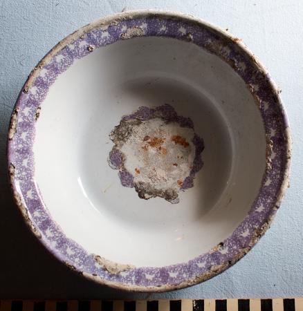 På undersidan av djuptallriken syns tillverkningsstämpeln: MS Kuznetsova, el. ТОВАРИШЕСТВА М.С. КУЗНЕЦОВА,