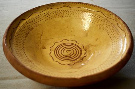 Stenfatet eller keramik kärlet donerades av Verner Åman den 23.6.1961 till Pörtom hembygdsförenings samlingar. Keramik kärlet tillverkades av Matts Åman (Krukars Matt). Keramik tallriken är gjord av rödaktig lera. Insidan av tallriken har målats/dekorerats med en ljusare brun färg som har glaserats. Mönstret på insidan av tallriken kan ses på bilderna, men det är prickar som bildar cirklar som följer kanten av tallriken. Det finns även en hel-ritad vågig linje.