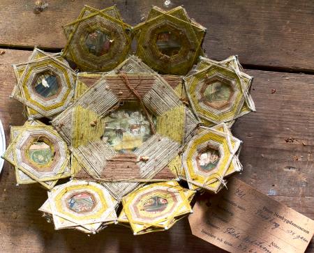 Diverse ryska bilder och texter som klippts ut och blivit en del av korgen.
