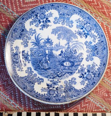 Tallriken tillkom från Isak Dahlas auktion som gåva den 26.6.1962 till Pörtom hembygdsförenings samlingar. Tallriken gjordes av Arabia i Finland under 1900-talet. Tallriken är gjord av vitt porslin och blåblommig och landskaps motiv. Tallriken har tidigare limmats, eftersom en spricka samt brun häftmassa är synlig på undersidan av tallriken.